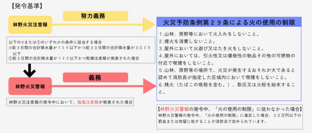 火災予防条例の「火の使用の制限」について、注意報では「努力義務」、警報では「義務」が課せられます。