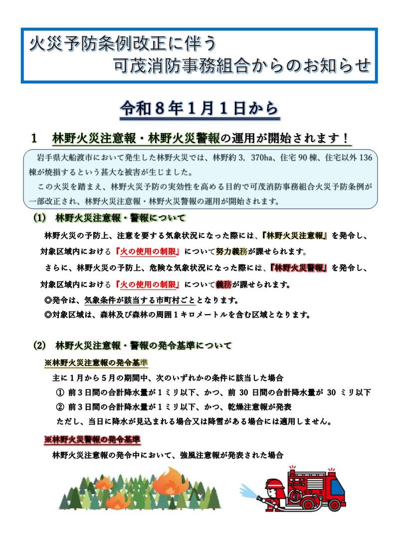 令和7年2月26日に発生した岩手県大船渡市林野火災では、延焼範囲が約3,370ha、焼損棟数226棟と大きな被害が発生し、延焼範囲としては平成以降国内最大規模に達しました。これを受け、林野火災を未然に防止するため、林野火災注意報や林野火災警報が発令できるよう火災予防条例が改正されました。発令された場合、「火の使用の制限」について、林野火災注意報の場合は努力義務、林野火災警報の場合は義務が課せられます。